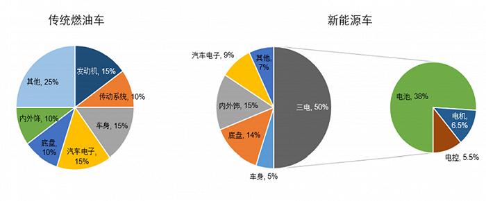 根據(jù)高工機(jī)器人數(shù)據(jù),在燃油車成本構(gòu)成中,發(fā)動(dòng)機(jī)、車身與汽車電子占比最高,均為15%,底盤、傳動(dòng)系統(tǒng)分別占比10%;而在電動(dòng)車中,“三電”系統(tǒng)占比高達(dá)50%,其中電池占比最高,為38%,電機(jī)占比6.5%,電控占比5.5%。