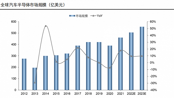 根據(jù)Gartner 和Statista數(shù)據(jù),2012年以來,全球汽車半導(dǎo)體規(guī)模整體呈上升趨勢(shì),2020年受疫情影響僅有390億美元,受益新能源車滲透率提升,預(yù)計(jì)到 2023年,全球汽車半導(dǎo)體市場(chǎng)規(guī)模將達(dá)到555億美元。