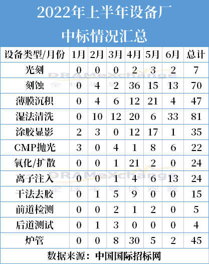 而結(jié)合中標(biāo)數(shù)據(jù)看,2022 年上半年國內(nèi)主要設(shè)備廠共中標(biāo)379臺(tái)工藝設(shè)備,濕法清洗設(shè)備81臺(tái),數(shù)量排名第一,中標(biāo)較多廠商為北方華創(chuàng)、中微公司、拓荊科技、芯源微、盛美上海等。