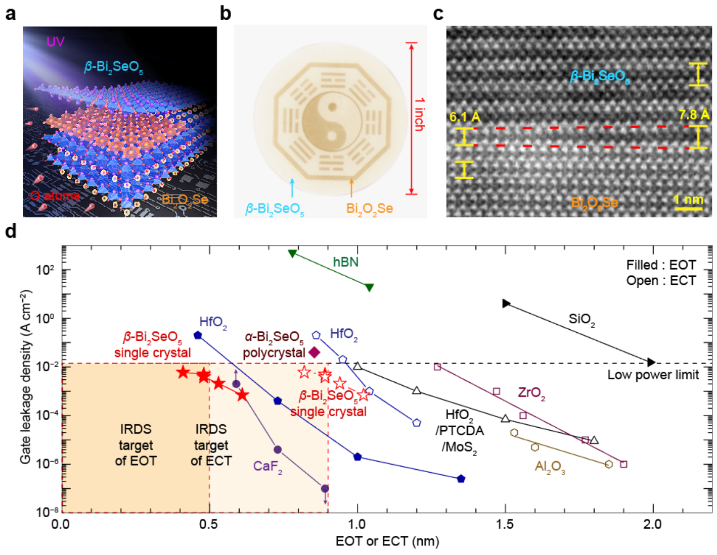 圖1.單晶自然氧化物柵介質(zhì)β-Bi2SeO5的制備與性質(zhì)。(a)二維Bi2O2Se紫外光輔助插層氧化轉(zhuǎn)化為單晶柵介質(zhì)β-Bi2SeO5示意圖;(b)晶圓級區(qū)域選擇性制備二維Bi2O2Se / Bi2SeO5異質(zhì)結(jié);(c)二維Bi2O2Se /Bi2SeO5異質(zhì)結(jié)界面結(jié)構(gòu);(d)β-Bi2SeO5的等效厚度(EOT:等效氧化層厚度;ECT:等效電容厚度)及絕緣性與其他柵介質(zhì)的對比。