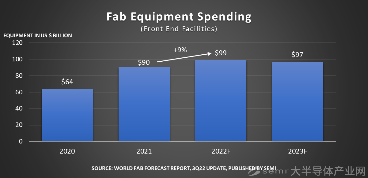 美國加州時間2022年9月27日,SEMI在其最新的季度《世界晶圓廠預(yù)測報告》(World Fab Forecast)中宣布,2022年全球晶圓廠設(shè)備支出預(yù)計(jì)將同比增長約9%,達(dá)到990億美元的歷史新高。