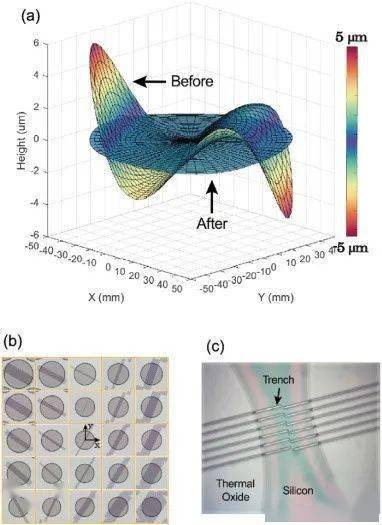 (a)在圖案化過(guò)程之前(S形)和之后(平面形)測(cè)量的晶圓表面。(b)用于平整晶圓表面的25個(gè)單元的顯微鏡圖像。(c)兩個(gè)單元之間區(qū)域的顯微鏡圖像。