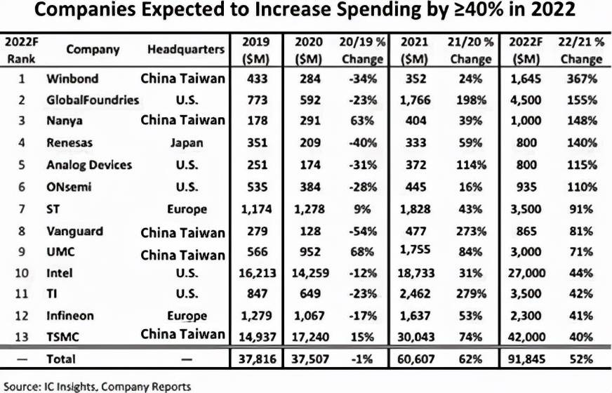 2021年半導(dǎo)體行業(yè)資本支出飆升36%之后,IC Insights預(yù)計(jì)2022年半導(dǎo)體行業(yè)資本支出將增長(zhǎng)24%,達(dá)到1904億美元的歷史新高。而就在三年前,半導(dǎo)體行業(yè)的資本支出僅為1025億美元,三年的時(shí)間,半導(dǎo)體行業(yè)的支出近乎翻了一倍。